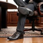 A linha Alth da Rafarillo traz o sapato masculino com salto embutido. Confeccionado com interior em PU, material antitranspirante e solado de borracha, este sapato masculino oferece mais conforto e segurança ao caminhar com seu sapato de couro. Perfeito para homens de baixa estatura. Sua calcanheira elevada em PU derramado somado ao salto externo do sapato, atinge até 7 cm de altura. Este sapato masculino com salto interno, além de ser totalmente em couro, possui abertura lateral com elástico, facilitando o calce.